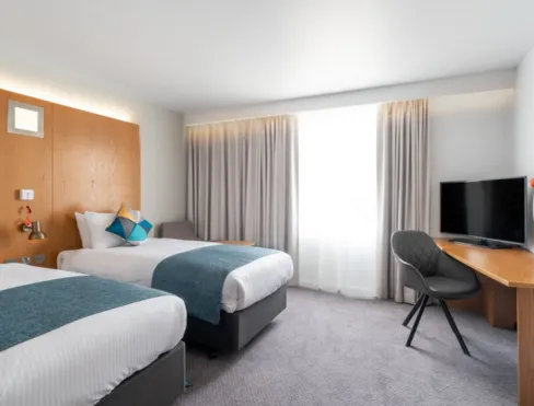 Inside, the hotel’s bright, air‑conditioned rooms feature walk‑in power showers, Smart TVs, bedside USB charging points, and comfortable workspaces, ensuring a restful and relaxing stay.